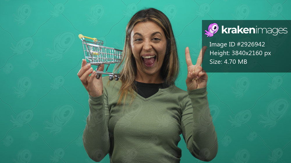 Young blonde woman holding a miniature shopping cart with one hand and showing a peace sign with the other in a teal studio; joyful playfulness.
