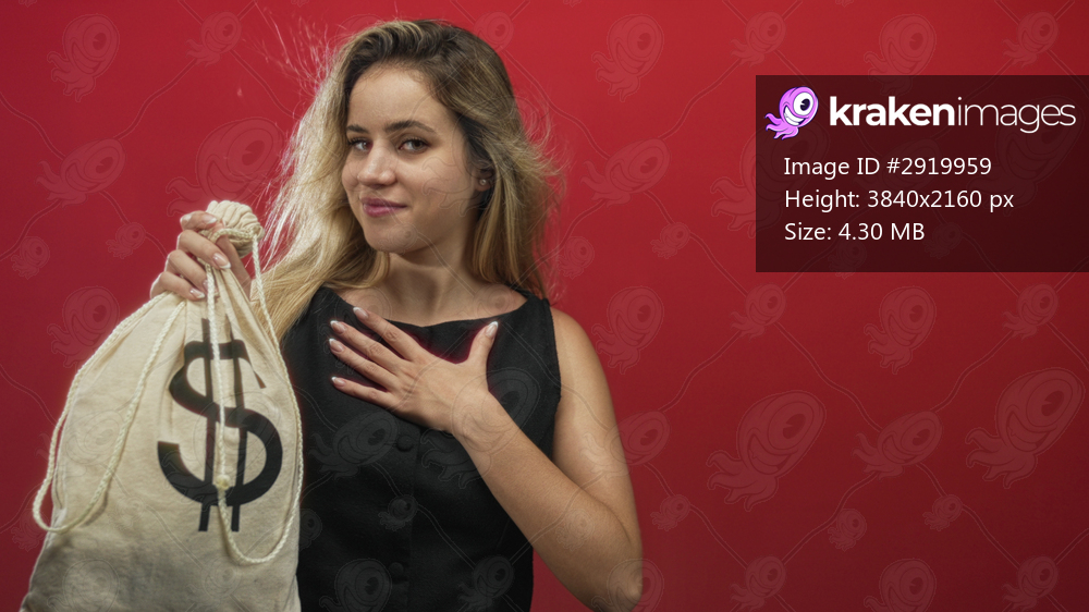 Young blonde woman holding a money bag with dollar sign and hand on chest in studio; confidence wealth success.