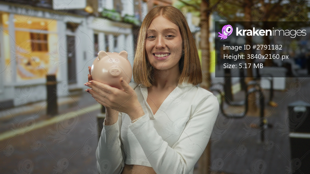 Young blonde woman holding a piggy bank in an urban street setting with blurred city background, expressing financial savings outdoors with a joyful smile in daylight. - Kraken Images