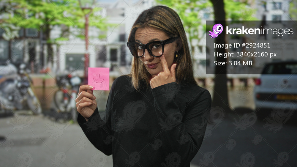 Young blonde woman holding a pink sticky note with a drawn smile while touching her glasses on a city street in amsterdam; playful mischief.