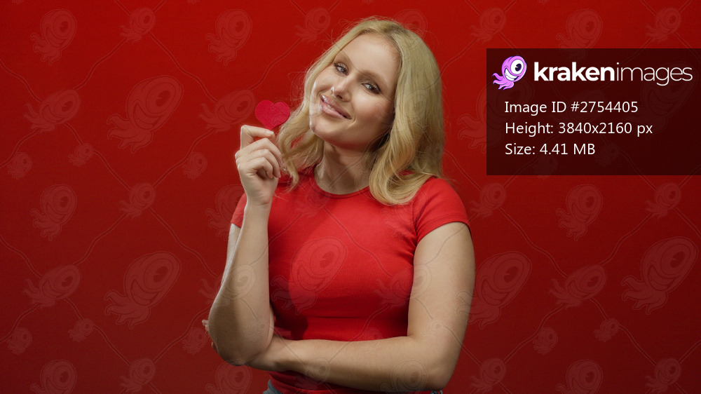 Young blonde woman holding a red heart against a vibrant red background showcasing emotions of love and happiness.