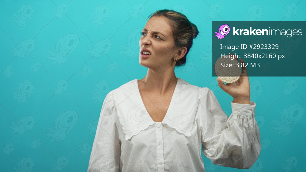 Young blonde woman holding a rice cake and grimacing in a studio with turquoise background; disgust.