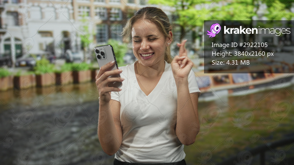 Young blonde woman holding a smartphone with fingers crossed on a street beside an amsterdam canal; hope luck.