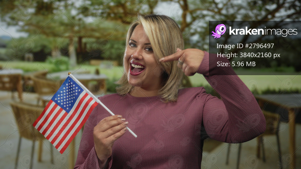 Young blonde woman holding american flag on sunlit outdoor terrace of building during summer; patriotic pride.