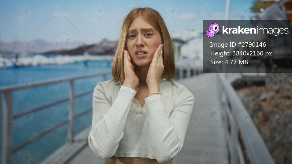 Young blonde woman holding cheek with both hands on sunlit seaside promenade; discomfort toothache.