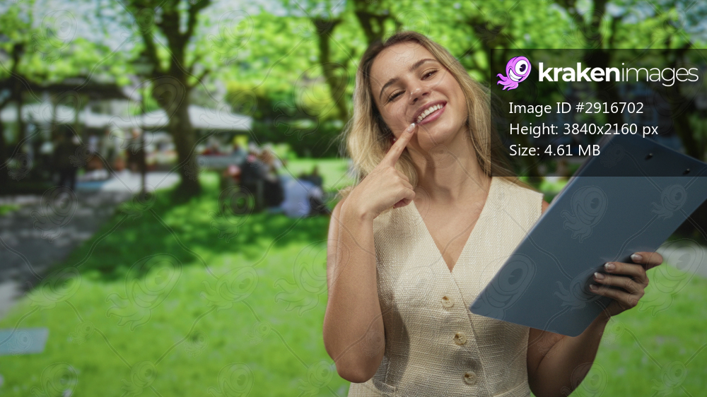 Young blonde woman holding clipboard, smiling, points finger to cheek in forest park scene; joy confidence.