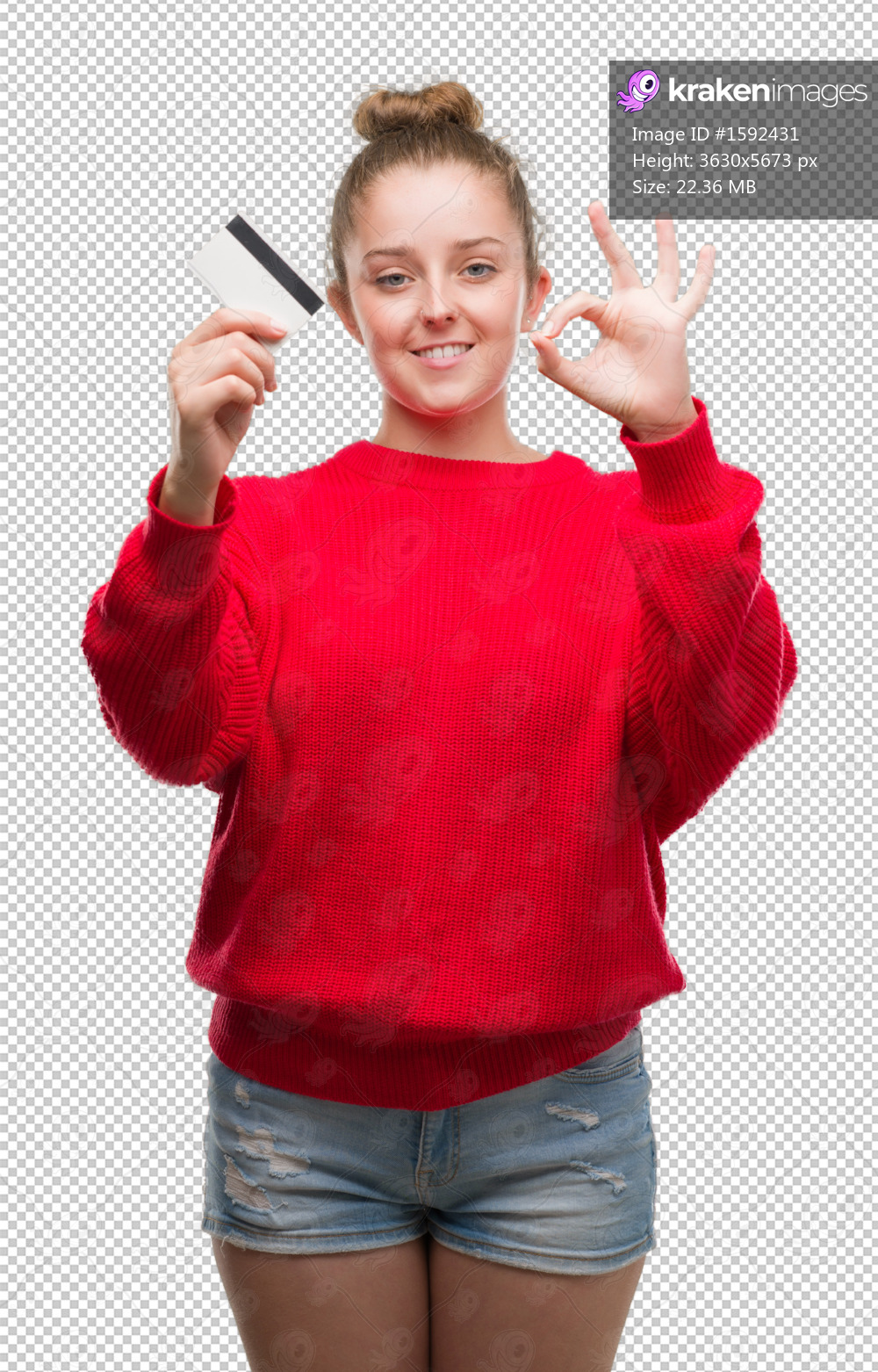 Young blonde woman holding credit card doing ok sign with fingers, excellent symbol