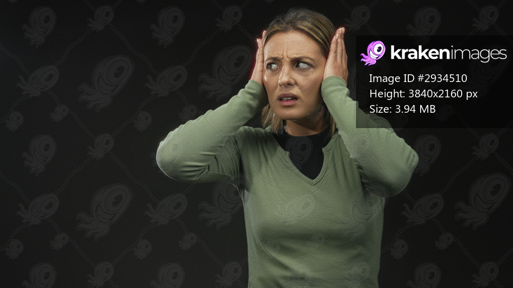 Young blonde woman holding hands to ears in black studio looking pained and tense; sensory overload distress.