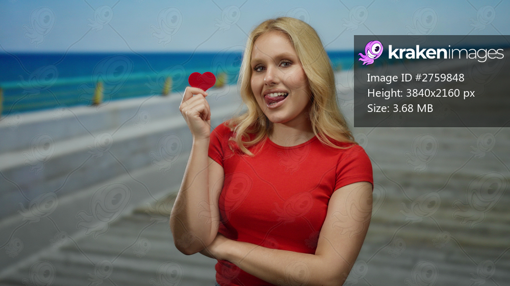 Young blonde woman holding heart on beach promenade with joyful expression against blue sea backdrop