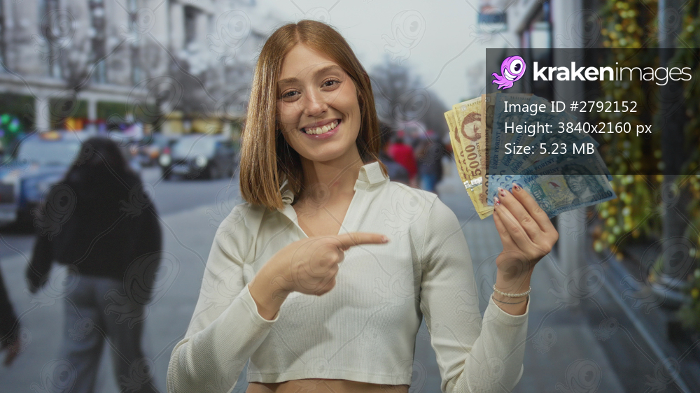 Young blonde woman holding hungarian forint banknotes smiling on an urban street with a cityscape in the background, showcasing currency outdoors.