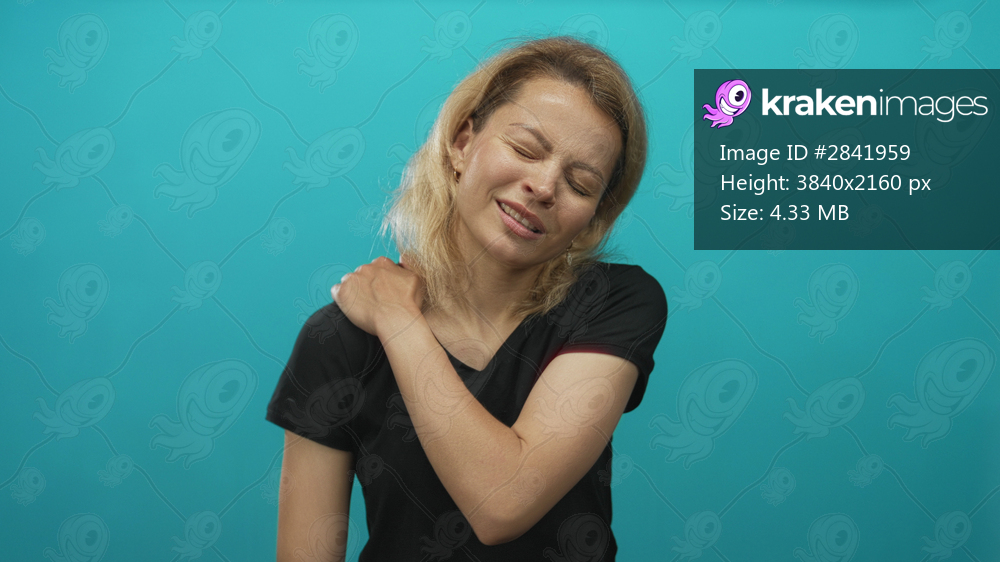 Young blonde woman holding lower back and wincing at pain against turquoise studio wall; discomfort.