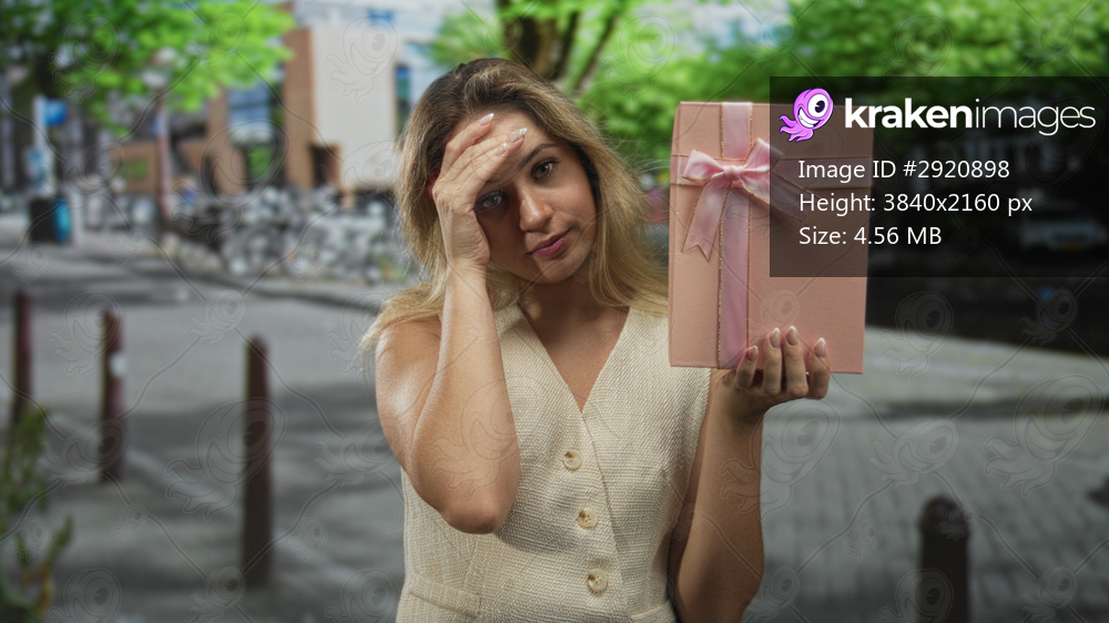 Young blonde woman holding pink gift box with hand on forehead in city street while presenting a gift; tired disappointment.