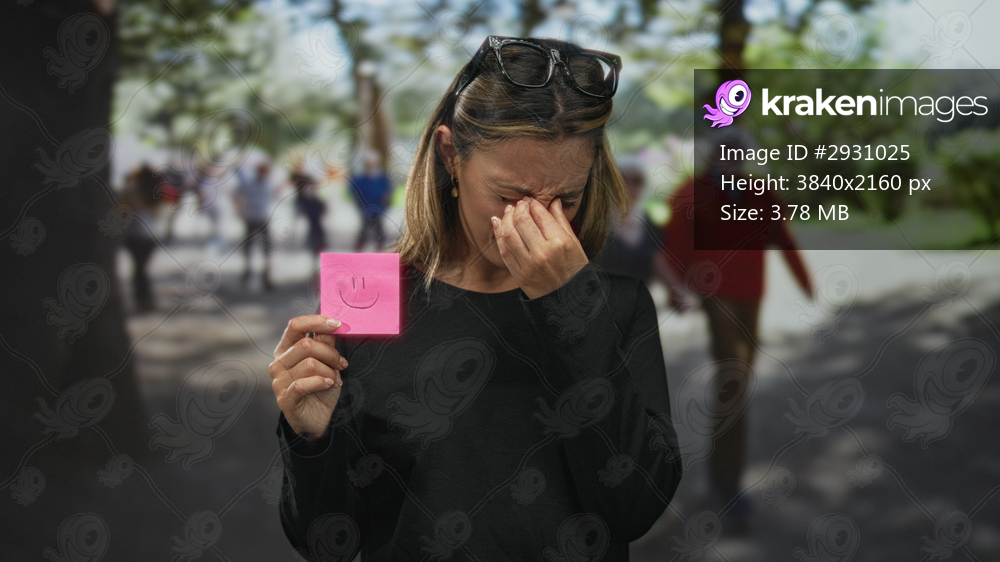 Young blonde woman holding pink sticky note with smile while pinching nose and covering eyes in street scene with sunglasses on head; masked sadness.