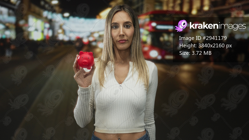 Young blonde woman holding red piggy bank with raised hand and neutral face on busy city street at night; concern saving money.