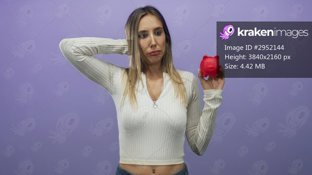 Young blonde woman holding red piggybank with hand behind head in studio; money savings finance worry.
