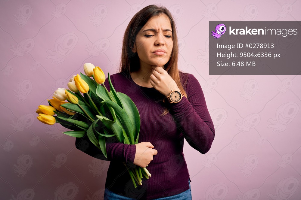 Young blonde woman holding romantic bouquet of yellow tulips flowers over pink background Touching painful neck, sore throat for flu, clod and infection
