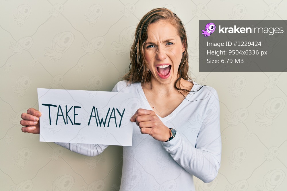 Young blonde woman holding take away food smiling and laughing hard out loud because funny crazy joke.