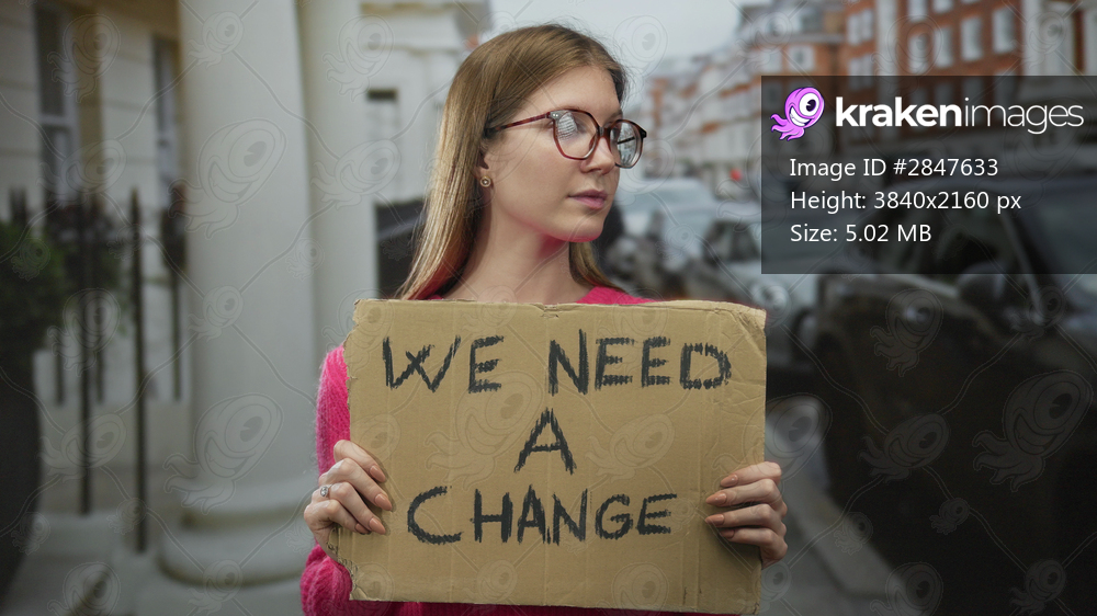 Young blonde woman holds cardboard protest sign with handwritten slogan on busy street lined with parked cars; protest activism hope.