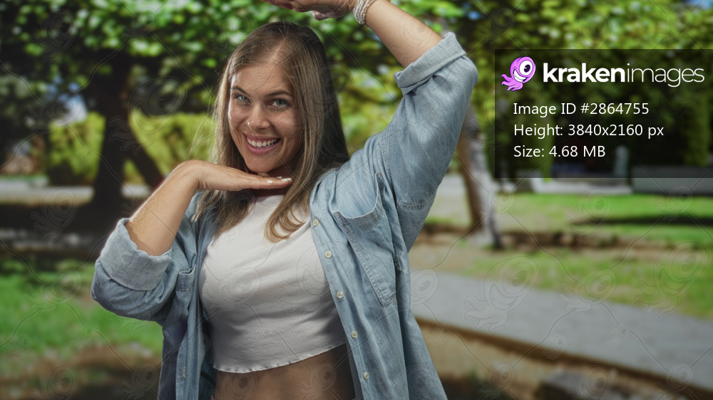 Young blonde woman holds chin with hand and smiles in vibrant forest under green canopy; playfulness.