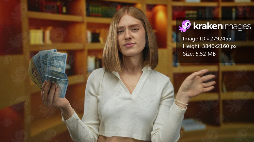 Young blonde woman holds fan of hungarian forint banknotes and raises her other hand palm forward in library; rejection hesitation.