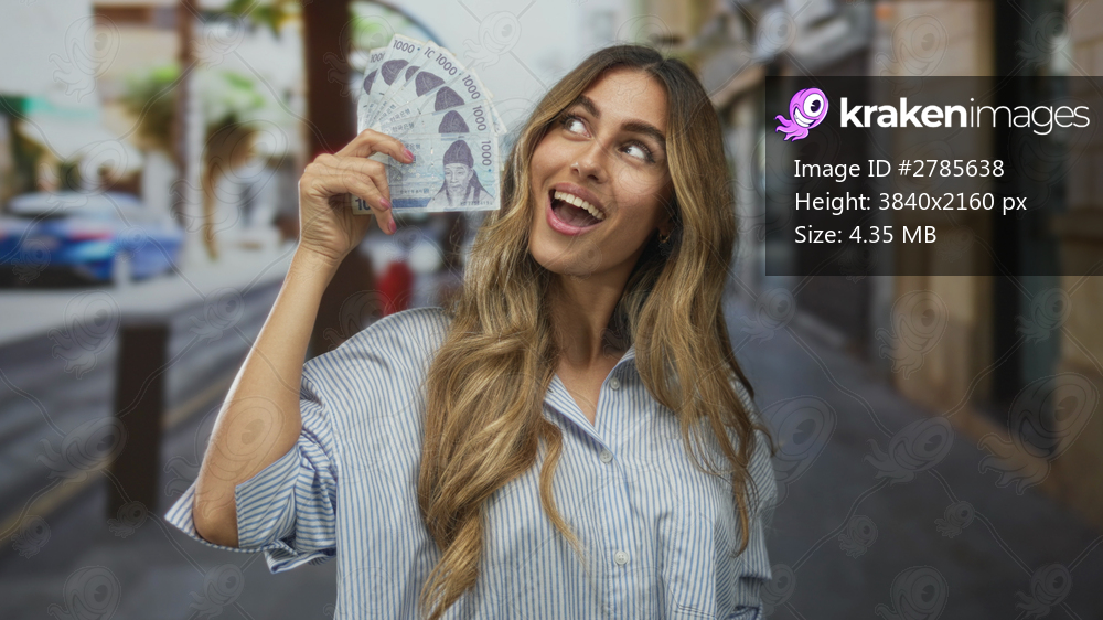 Young blonde woman holds fan of korean won banknotes in raised hand on sunny city street; prosperity confidence.