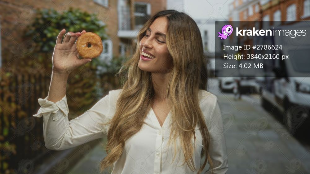 Young blonde woman holds glazed donut at eye level on busy city street; joy craving indulgence delight.