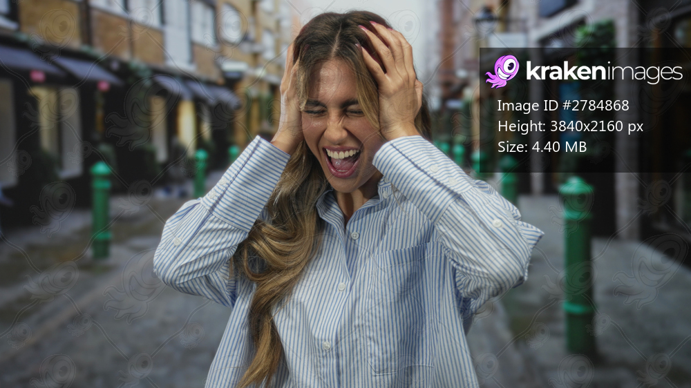 Young blonde woman holds head with both hands and squeezes eyes shut in a narrow urban alleyway; stress frustration tension distress.