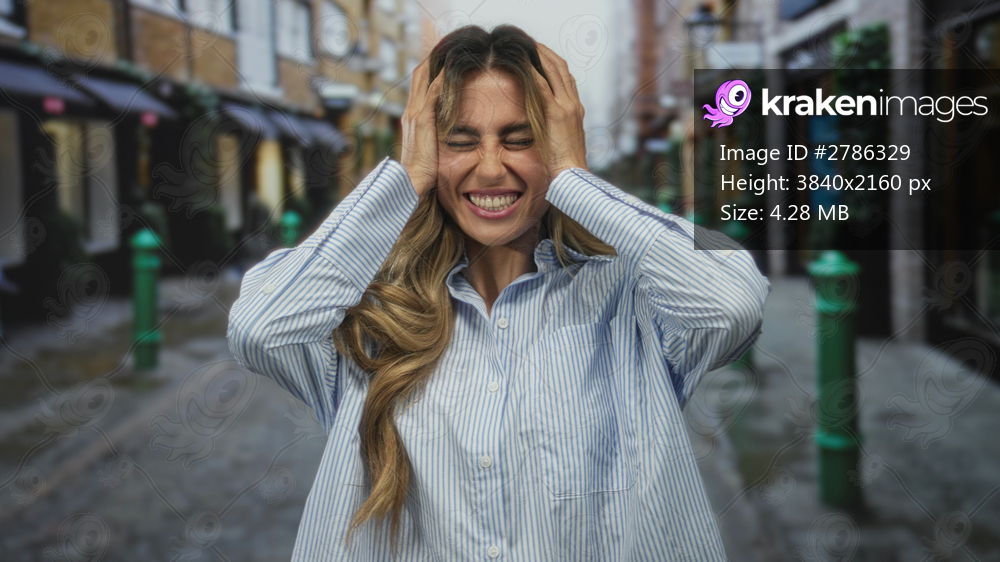Young blonde woman holds head with both hands and squeezes eyes shut in a narrow urban alleyway; stress frustration tension distress.