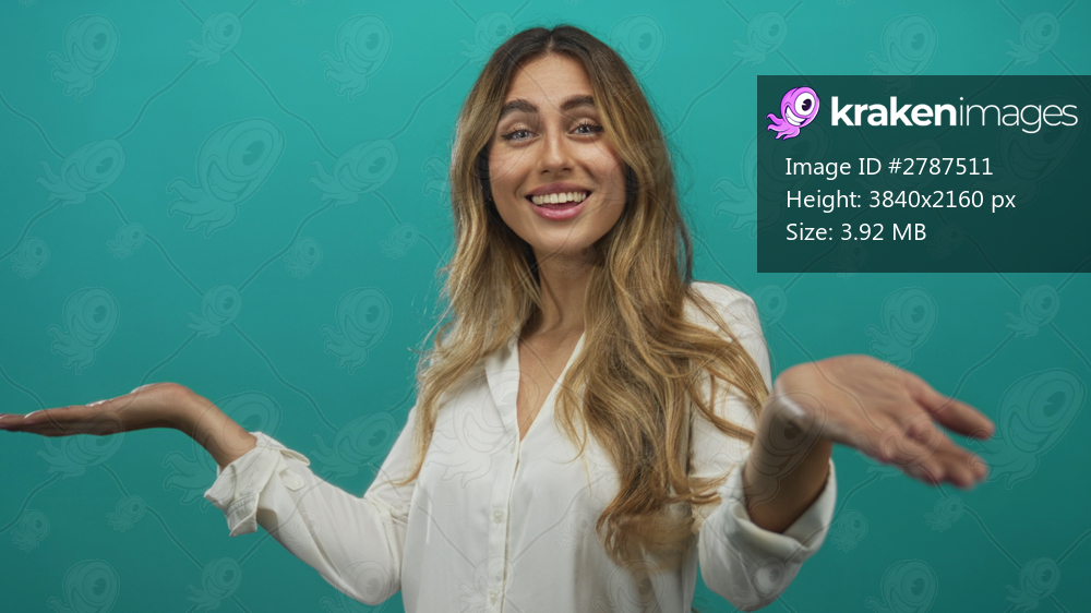 Young blonde woman holds open palms toward camera in a bright photography studio; welcome warmth confidence.