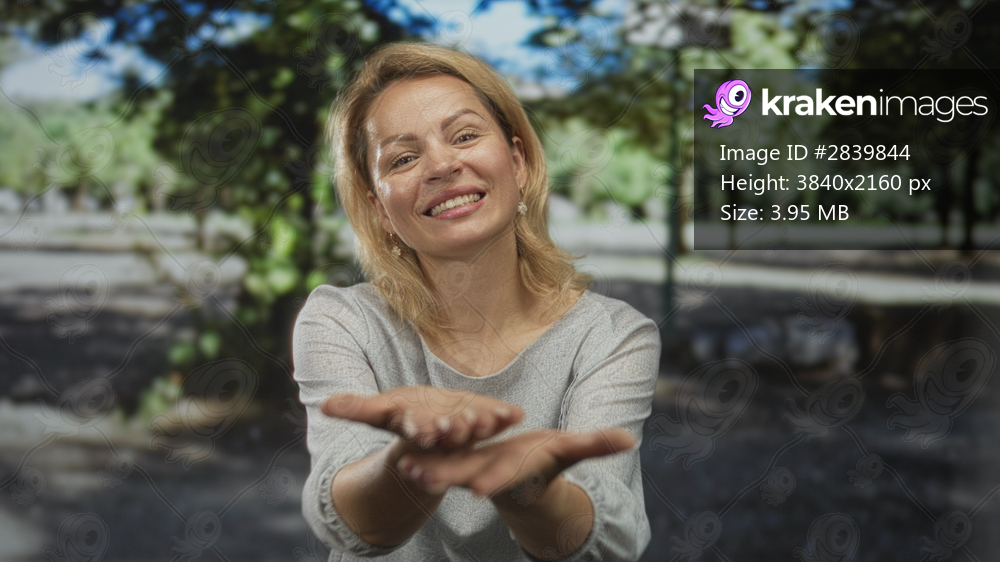 Young blonde woman holds out palms under leafy trees in sunlit green forest clearing; warmth connection joy.