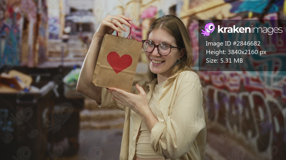 Young blonde woman holds paper bag with red heart in urban graffiti covered ghetto street; love joy.