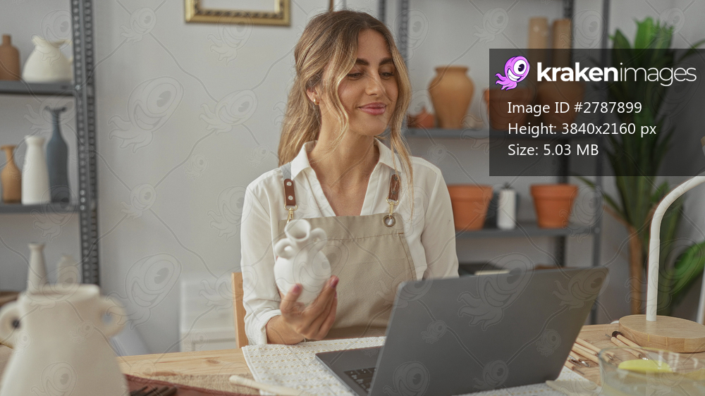 Young blonde woman holds small white ceramic vase in pottery studio; creativity calm contentment focus.