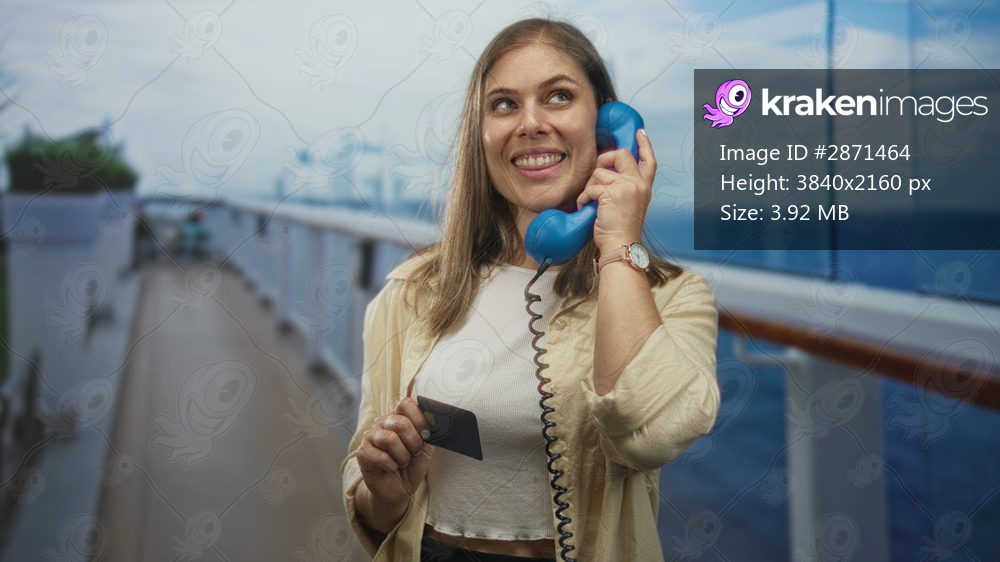 Young blonde woman holds telephone handset and creditcard on deck with ocean view; travel excitement.