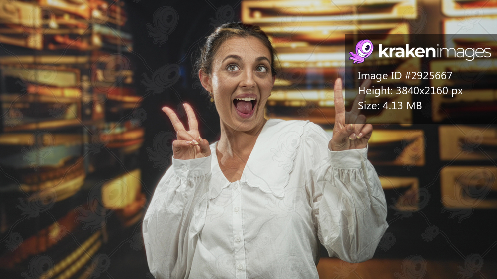 Young blonde woman holds up peace sign with fingers in building gallery amid ship exhibits; playful celebration.