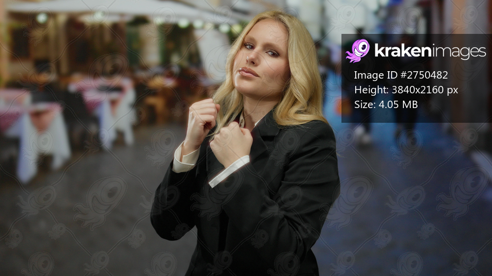 Young blonde woman in a black suit showing a confident pose on a bustling city street with blurred cafes and pedestrians in the background.
