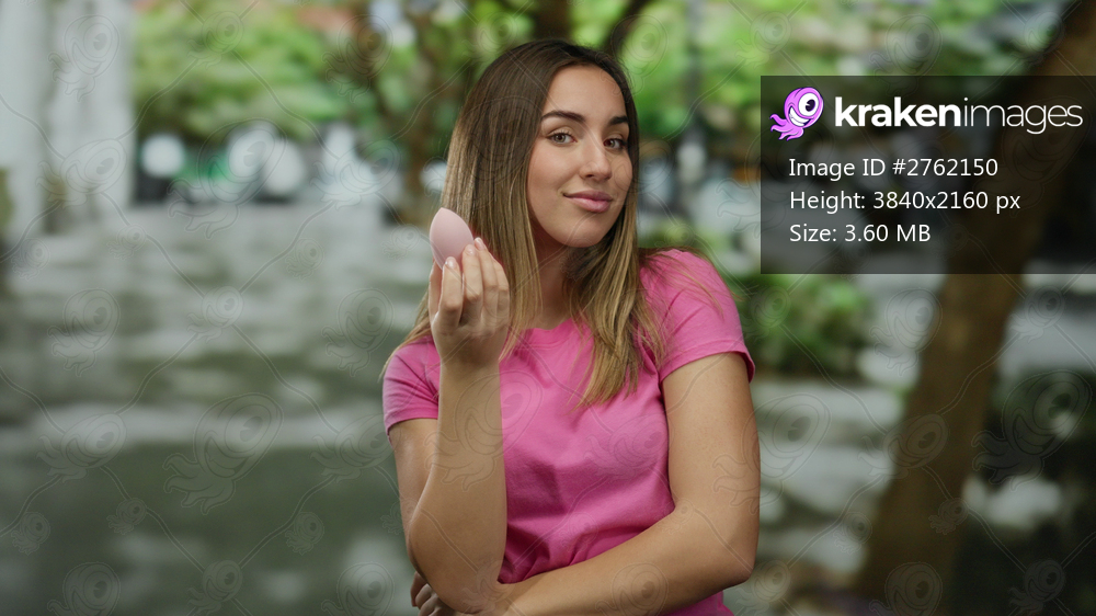 Young blonde woman in a pink shirt outdoors using a makeup sponge on a bright street, surrounded by green trees, joyfully enjoying a casual urban day.