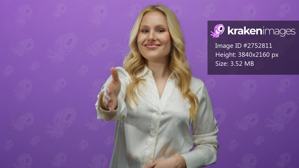 Young blonde woman in a white blouse smiling confidently with an open hand ready for a handshake against a vibrant purple background, symbolizing professionalism and approachability. - Kraken Images