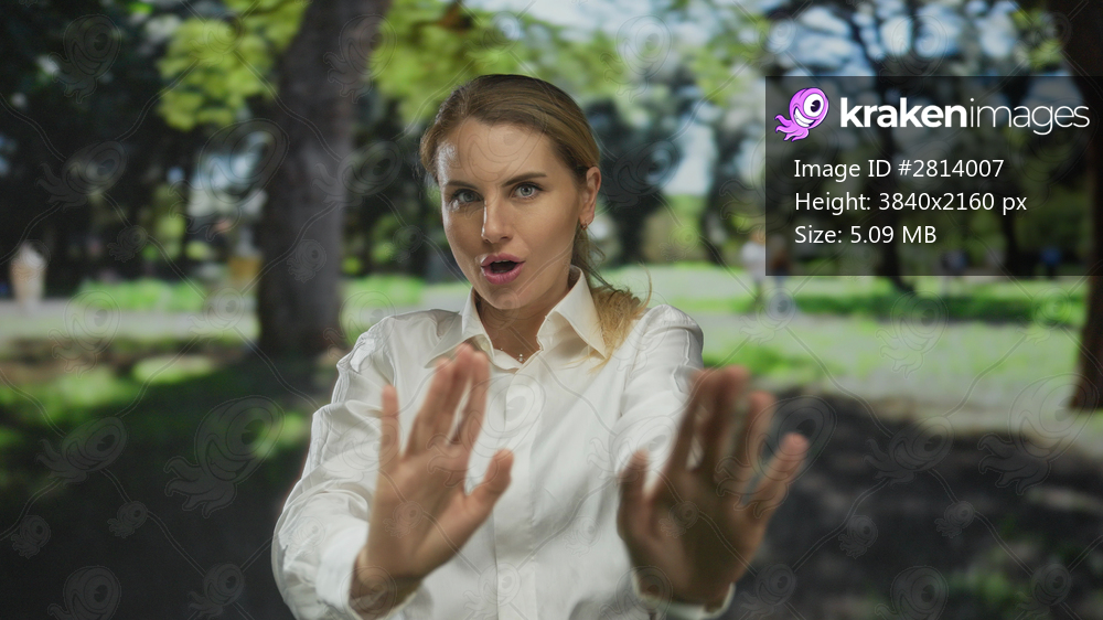 Young blonde woman in a white shirt makes a rejection gesture with hands outdoors in a sunny green park setting, reflecting a gesture of refusal or defense. - Kraken Images