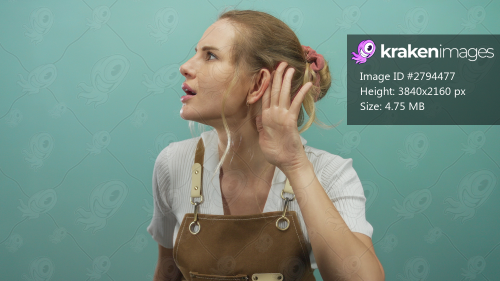 Young blonde woman in an apron gestures listening against an isolated green background, expressing curiosity and engagement in a studio setting.