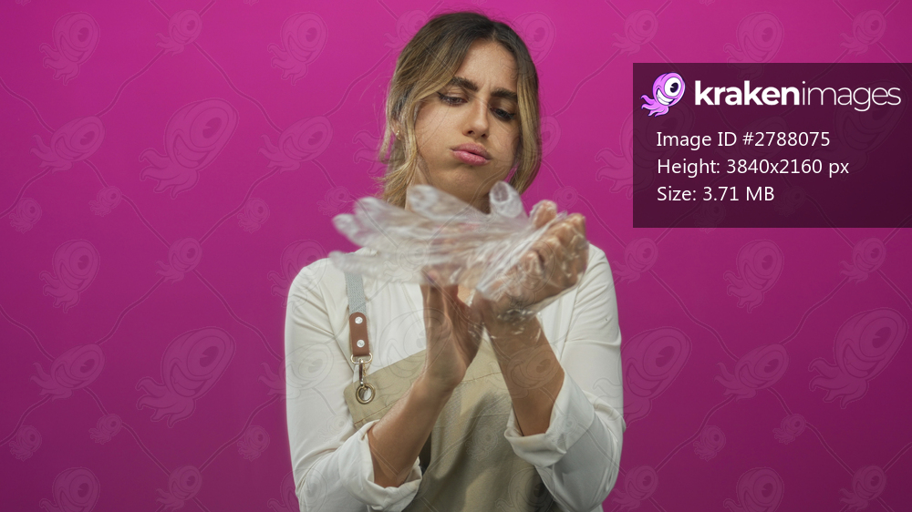 Young blonde woman in apron peels off plastic glove with gentle movements in a photo studio; stress relief calm focus.