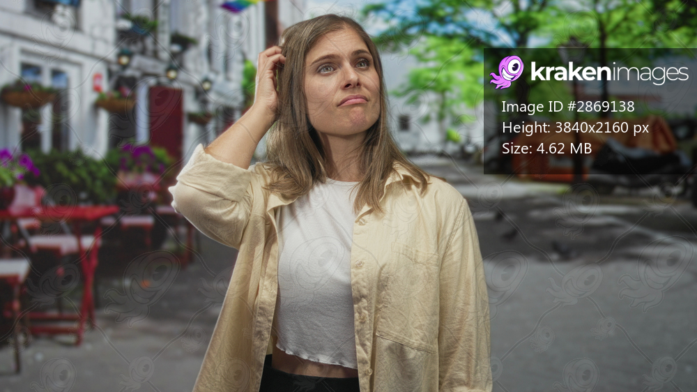 Young blonde woman in beige shirt adjusting hair on outdoor city street beside red cafe building; confidence.
