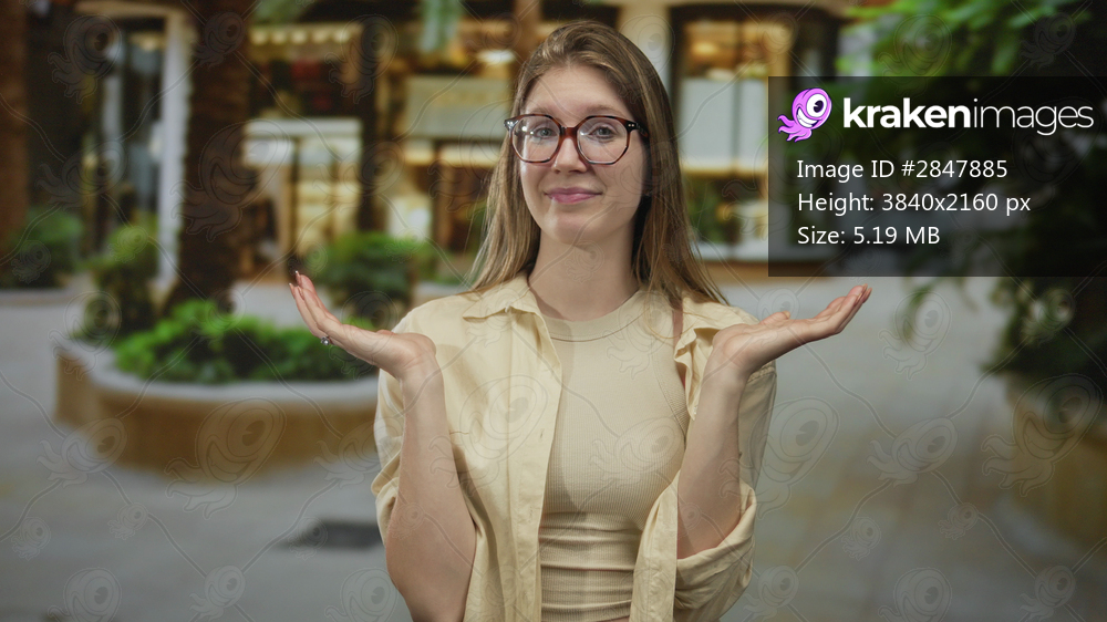 Young blonde woman in beige shirt shrugs shoulders with upturned palms on urban street; uncertainty.