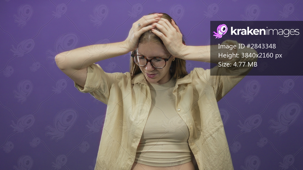 Young blonde woman in beige top holds head with both hands with eyes closed in purple studio; stress.