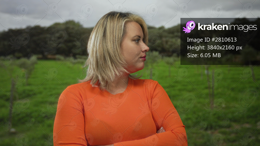 Young blonde woman in bright orange sweater crosses folded arms with determined gaze in a forest setting; confidence empowerment.