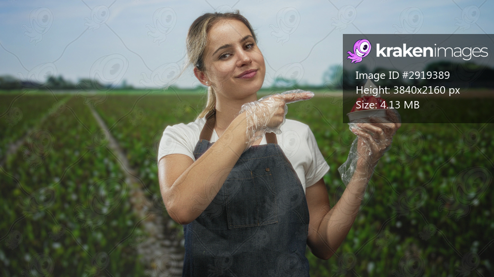 Young blonde woman in denim apron and plastic gloves pointing to a strawberry dessert cup in a countryside field; warm summer joy.