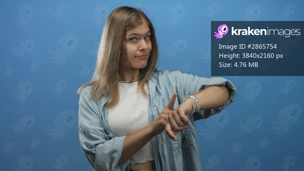 Young blonde woman in denim shirt points finger to watch on her wrist in blue studio session; impatience.