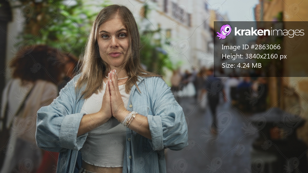 Young blonde woman in denim shirt pressing hands together on a busy sunlit cobblestone street; serenity.