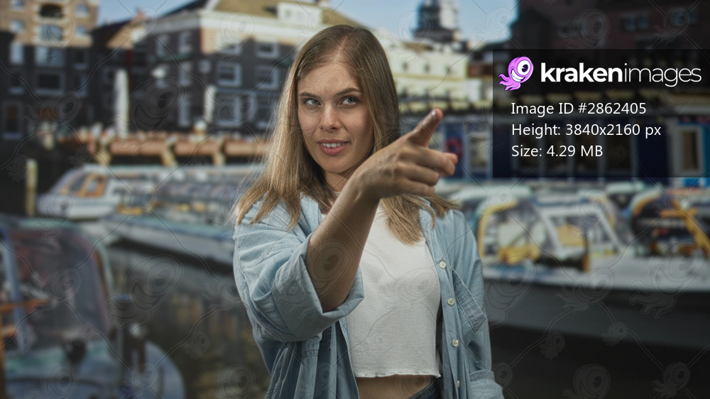 Young blonde woman in denim shirt smiles and points finger by canal on street in amsterdam; confidence.