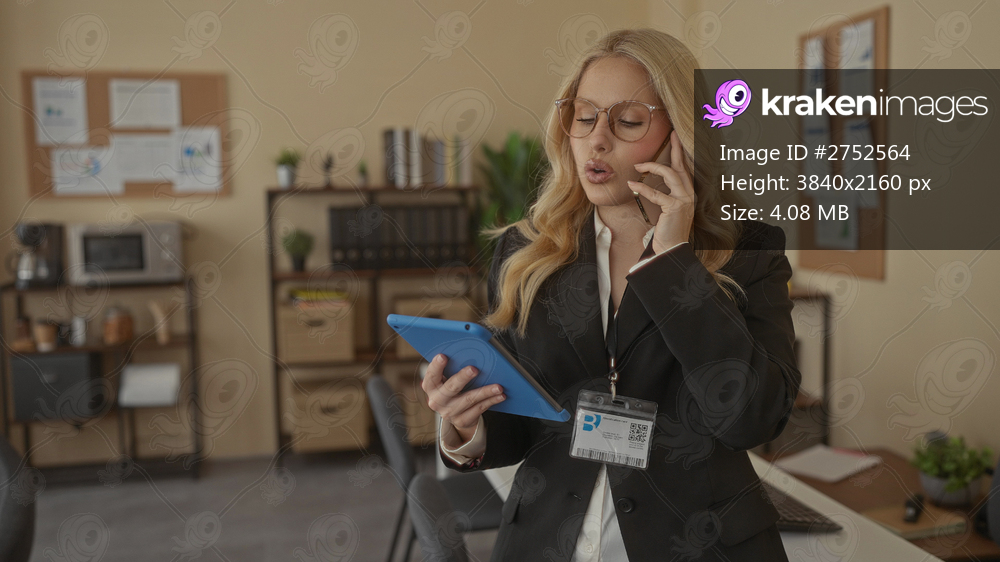 Young blonde woman in glasses multitasks by talking on the phone and using a tablet in a modern office environment, showcasing business and technology interaction. - Kraken Images