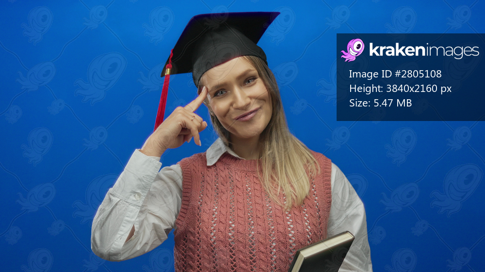Young blonde woman in graduation cap joyfully gestures while holding a book against an isolated blue background, celebrating academic success.